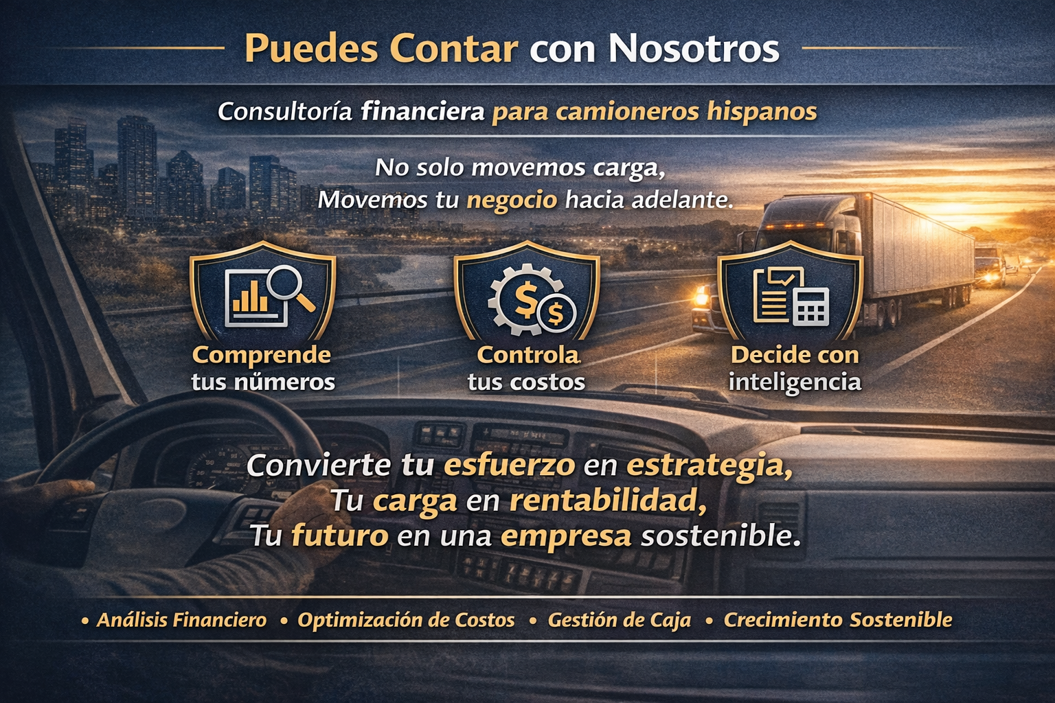 Hoy concentramos nuestros esfuerzos en desarrollar un modelo de consultoría financiera especializado para camioneros hispanos y pequeñas flotas, integrando experiencia operativa real con herramientas prácticas de análisis, control y planificación.